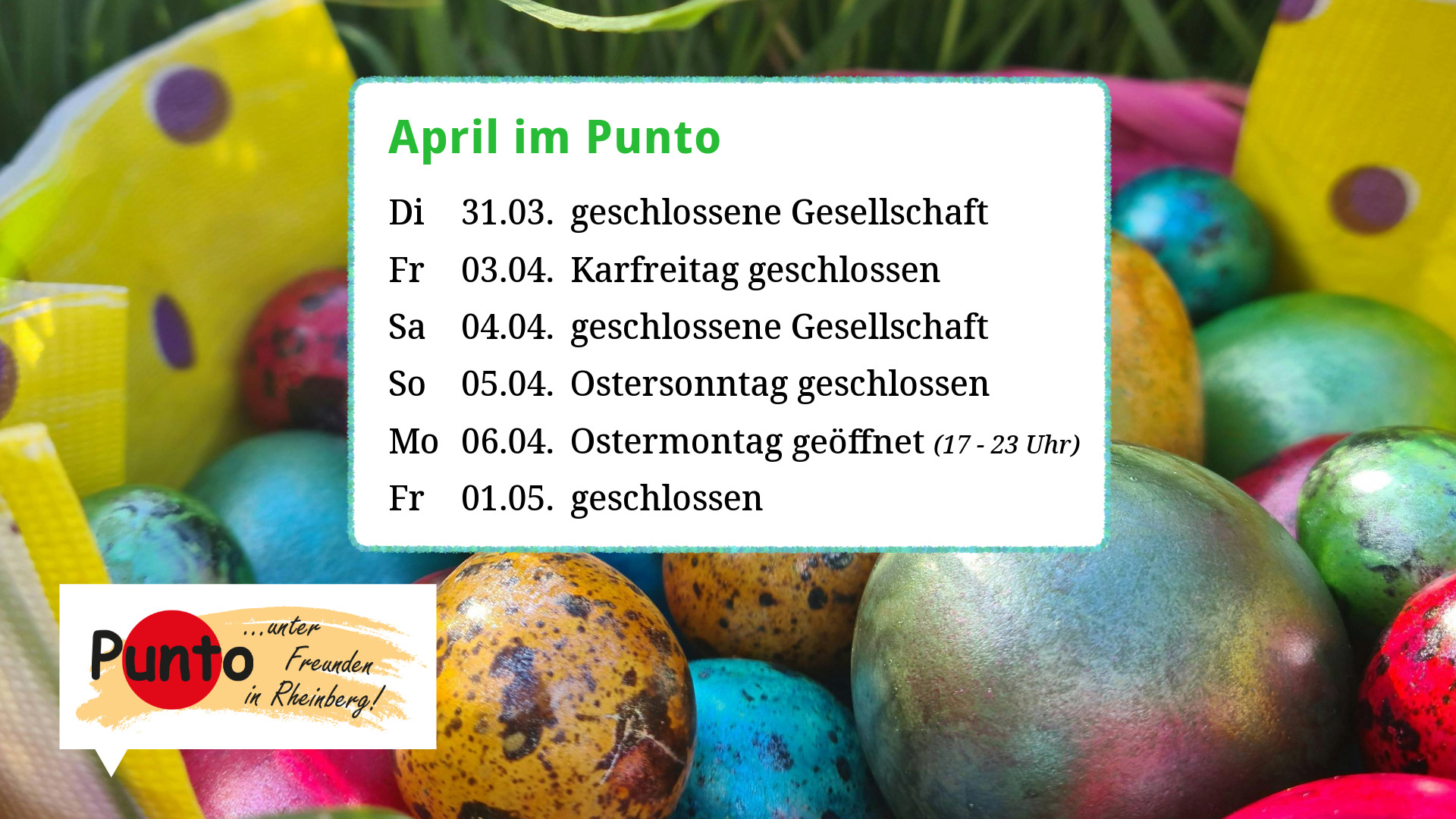 UPDATE: Die geschlossene Gesellschaft am 25.4. wurde abgesagt, daher ist das Punto an diesem Samstag regulär geöffnet. Am Freitag, den 1. Mai ist das Punto geschlossen.
