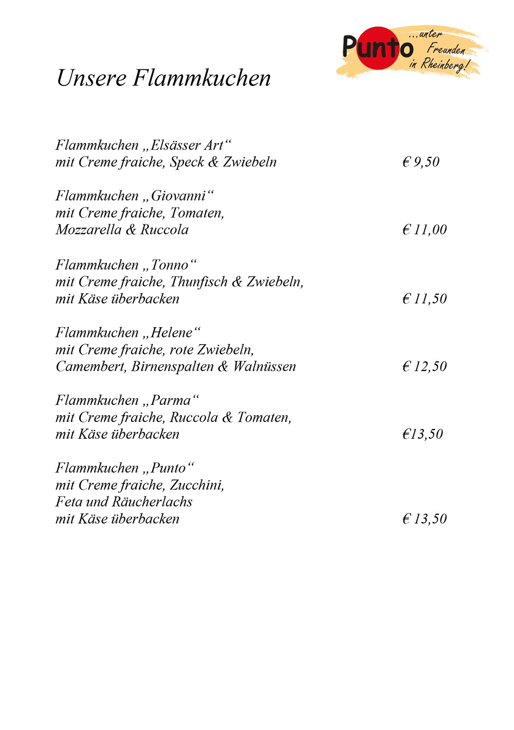 Seit Koch Christoph Drötboom in der Küche den Löffel schwingt, ist das Punto mehr Restaurant als Kneipe. Wir bieten raffinierte, gutbürgerliche Küche. Es gibt leckere Suppen, gesunde Salate, Kleinigkeiten für Zwischendurch, feine Flammkuchen, Deftiges – wie Burger, Steaks und Schnitzel – sowie süße Desserts. Hier können Sie einen Blick in unsere Speisekarte werfen: